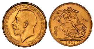 Entre 1911 y 1932 Jorge V siguió la misma pauta de los sovereing, llegándose incluso a acuñar en la ceca de Bombay, en la India. Durante la Primera Guerra Mundial, Gran Bretaña necesitaba lingotes de oro para financiar el esfuerzo bélico. La cifra de billetes en circulación aumentó de forma regular y, en pocos años, el soberano de oro dejó de ser utilizado en las transacciones cotidianas, desapareciendo a la muerte de Jorge V prácticamente hasta 1957, aunque los soberanos fueron incluidos en las pruebas monetarias de Jorge VI; también, aunque no se concedieron, a Eduardo VIII en 1936, y para la reina Isabel II en 1953.