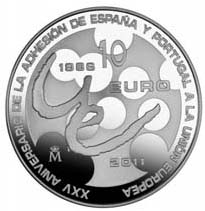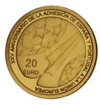 Con motivo del vigésimoquinto aniversario de la adhesión de España y Portugal a la Unión Europea, las cecas nacionales de ambos países -–La Fábrica Nacional de Moneda y Timbre-Casa de la Moneda por España y la Imprensa Nacional Casa da Moeda de Portugal- han realizado una emisión de cuatro piezas en oro y plata de ley en calidad proof.