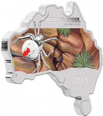 Nueva emisión de esta original colección de la ceca de Perth con monedas en forma de mapa de Australia. El animal elegido es la venenosa araña de espalda roja.