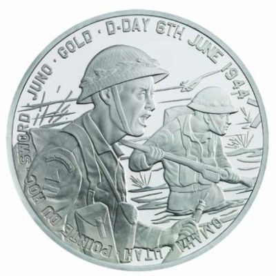 La Royal Mint acuña para Alderney una emisión muy limitada que recuerda las siete décadas transcurridas desde el desembarco de las tropas aliadas en Normandía. Con un mismo valor facial de cinco libras, se compone de piezas en oro, plata o cupro-níquel.