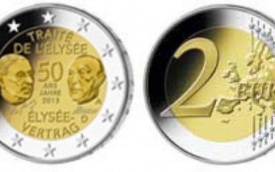 Esta moneda conmemorativa de 2 euros recordará en 2013 el medio centenario del acuerdo bilateral que selló la reconciliación de ambos países europeos. Es la primera vez que dos países de la zona euro emiten una moneda con un mismo motivo.