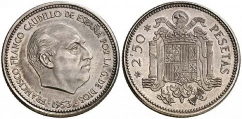 Pero sobre todo esperen a ver este ejemplar de 2,5 pesetas (lote nº 951) con fecha 1953 *19-54, acuñado en plata. Se considera una pieza única que podría ser la prueba de presentación que se acuñó para mostrarle a Franco. Su precio de inicio en la puja es de 9.000 euros.