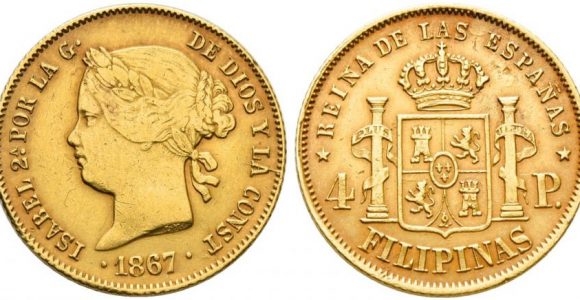 Con Isabel, desde 1861 a 1868, se acuñaron en Manila monedas de oro de 4, 2 y 1 peso, amonedación que era exclusiva para Filipinas. Hay fechas más escasas que otras, y algunas abundantes, pero ésta de 1867 para el 4 pesos es determinante, pieza clave. En septiembre de 1868 la revolución destronó a Isabel y se modificó el sistema monetario estableciendo la peseta como modelo.
